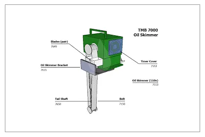 An oil skimmer is a device that separates oil or particles floating on a liquid surface. A common application is removing oil floating on water. Oil skimmers are not oil-water separator devices. They are used for oil spill remediation, as a part of oily water treatment systems, removing oil from machine tool coolant and removing oil from aqueous parts washers.